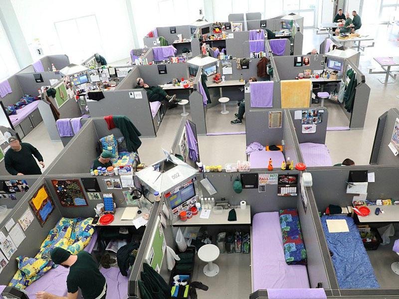 Məhbuslar qapıları olmayan kameralarda yaşayırlar. Konteynerə bənzəyən bu kameralar 16 sektordan ibarət bölmələrdən ibarətdir. Hər bölmədə 25 məhbus var.