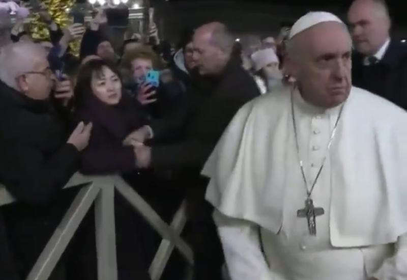 Kadrlardan görünür ki, dəmir çəpərin arxasında olan qadın Roma Papasının əlindən tutur. Roma Papası qadının hərəkətinə dərhal reaksiya verir, bir neçə dəfə digər əli ilə qadının əlinə zərbə endirir.