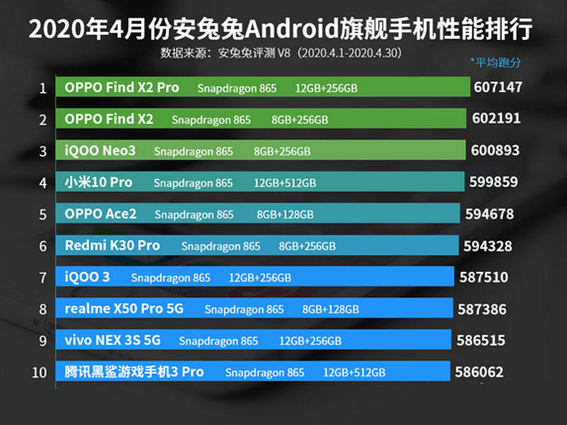 Reytinqin yuxarı hissəsini "Xiaomi Mi 10 Pro" (599 859 bal) və "OPPO Ace 2" (594 678) tamamlayıb. Sonrakı mövqelərdə "Redmi K30 Pro" (594 328), "iQOO 3" (587 510), "realme X50 Pro" (587 386), "vivo NEX 3S" (586 515) və "Black Shark 3 Pro" (586 062) modelləri yer alıb. Populyar bençmark tərtibatçıları qeyd edib ki, daha yüksək (90/120 QHs və daha yüksək) ekran yeniləmə tezliyi və sürətli toplayıcıya (Turbo Write texnologiyalı UFS 3.1 və ya UFS 3.0) malik smartfonlar bu funksiyalara sahib olmayan qurğulardan daha yaxşı nəticələr əldə edir.