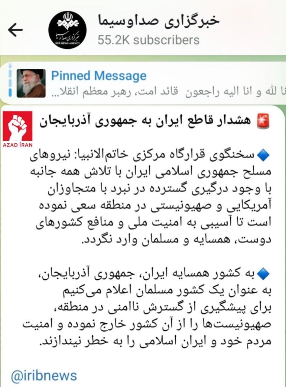 Milli.Az "Azad İran" teleqram kanalına istinadən xəbər verir ki, məlumat İran Dövlət Televiziyasının teleqram kanalında yerləşdirilib.