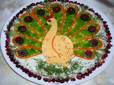 Zümrüd quşu: salatın ortasından bir qədər aşağıda ərinmiş pendirdən quş bədəninə bənzər dilim kəsib qoyun. Quyruğunu sürgəcdən keçirilmiş xiyardan düzəldin. Bəzək kimi halqa doğranmış qara gavalı və nar dənələrindən istifadə edə bilərsiniz. Quyruğun konturlarını yerkökündən nazik doğradığınız zolaqlardan düzəldin. Salatın ətrafı boyu isə nar dənələrini düzün.