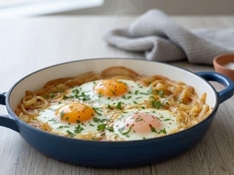 Yumurtaları soğanın arasına əlavə edərkən boşluq buraxmaq, pişərkən yumurtaların dağılmasının qarşısını alır və estetik görünüş yaradır.