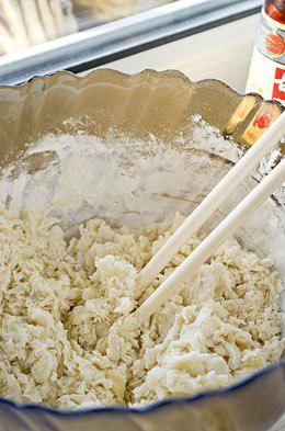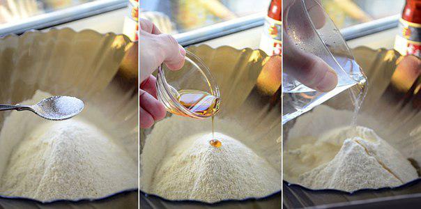 Unu ləyənə ələyin, duz, küncüt yağı və qaynar su qatıb taxta qaşıqla sürətlə qarışdırın, un tam islanıb ovuntuq kimi xəmir alınacaq. Bir qədər soyudub əlinizlə yoğurun.