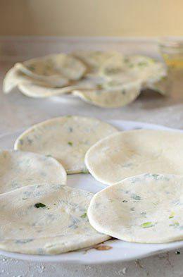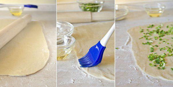 Masaya un səpib xəmiri 2-3 mm qalınlıqda düzbucaqlı yayın. Üzərinə bitki yağı çəkin (zövqə görə - günəbaxan, qarğıdalı, küncüt, acı sevirsinizsə, çili yağı və s.). Üzərinə doğranmış soğanı səpin.
