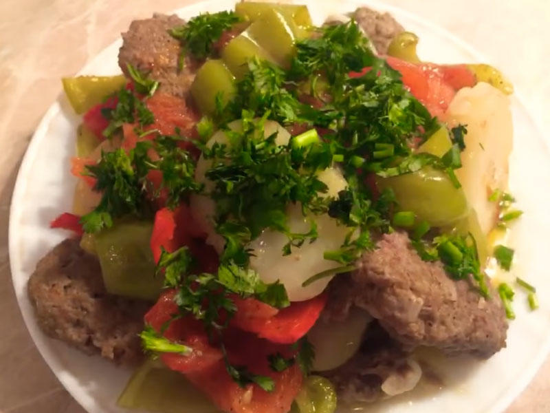 - Bütün tərəvəzləri təmizləyib yuyuruq. Soğanın ikisini ətlə bir maşından keçirib üstünə duz və istiot töküb qarışdırırıq.