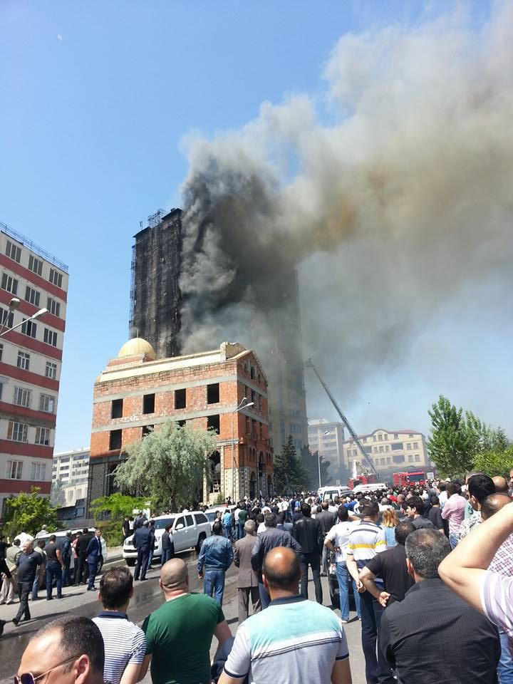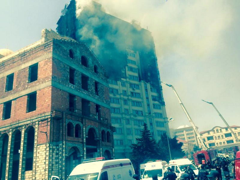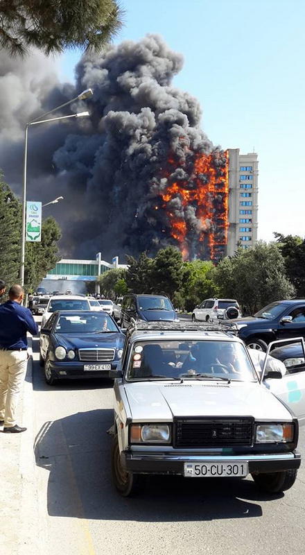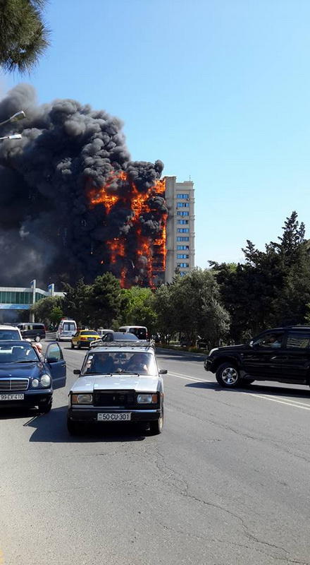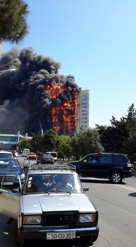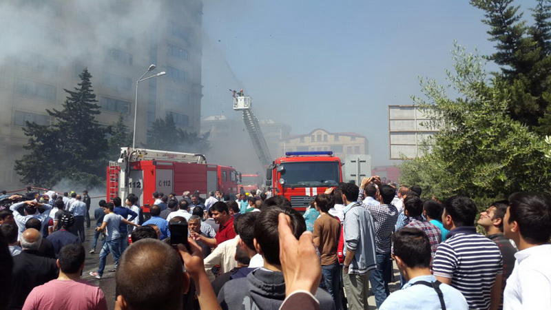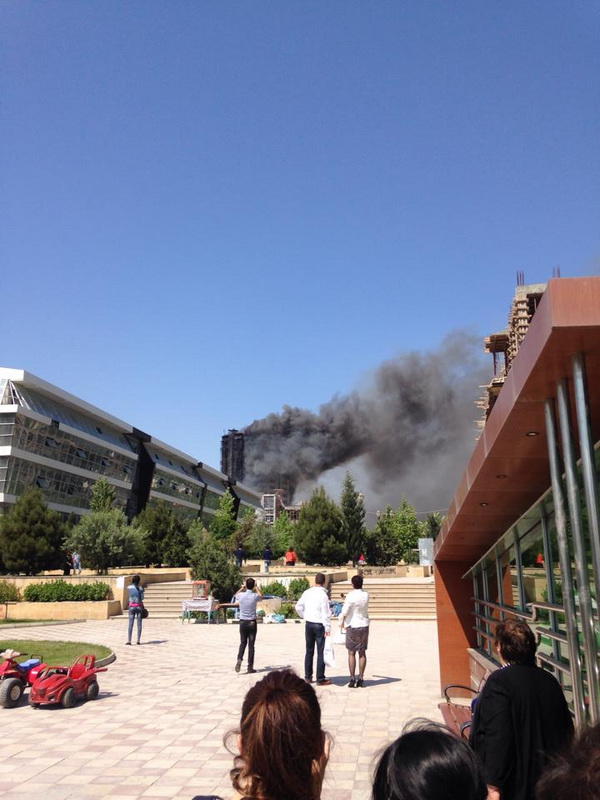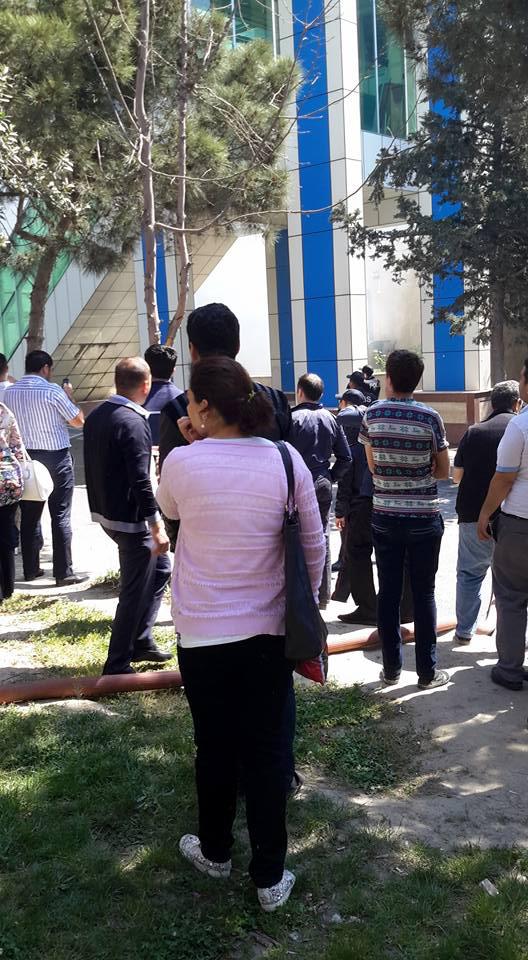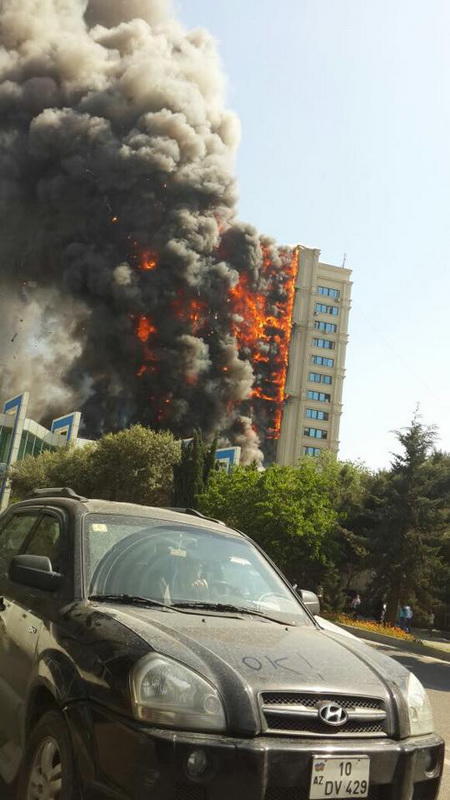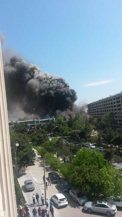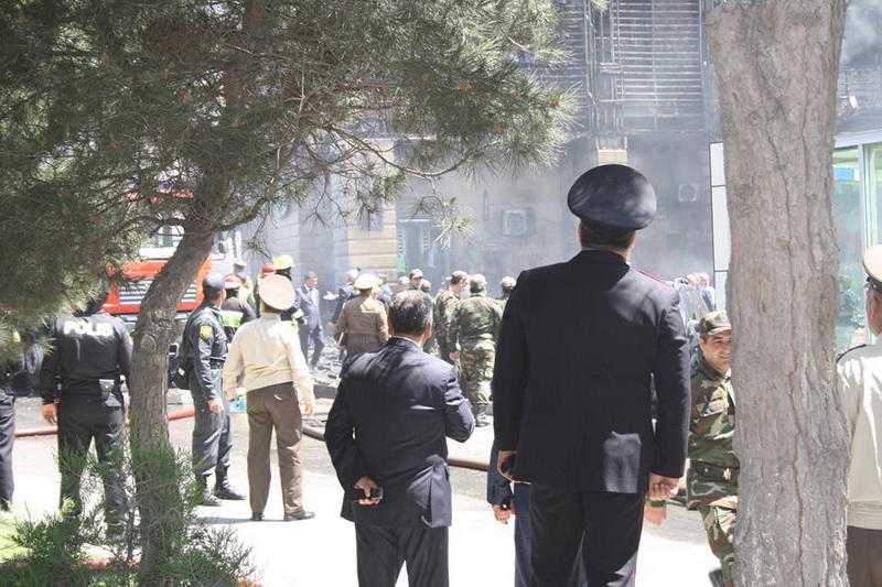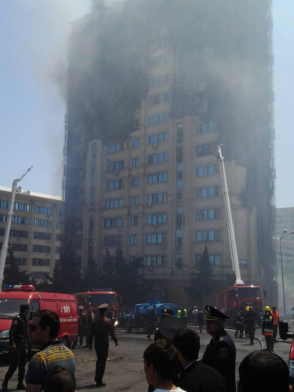 "FNH oradadır. İçəridə adamlar var. Dedilər ki, xilasedicilər içəridə evakuasiyaya başlayıblar. Maşınlara da ziyan dəyib. İnsan tələfatı haqda məlumat hələ ki yoxdur. Arada partlayış səsinə oxşayan səs gəlir, nə olduğunu anlaya bilmirəm. Yaxınlığa kimsə buraxılmır. Yanğınsöndürən maşınlar gəlməkdədir. Orada olduğum müddətdə təcili yardımın kimisə apardığını görmədim. İnşallah ki, içəridən hər kəsi çıxara biliblər".