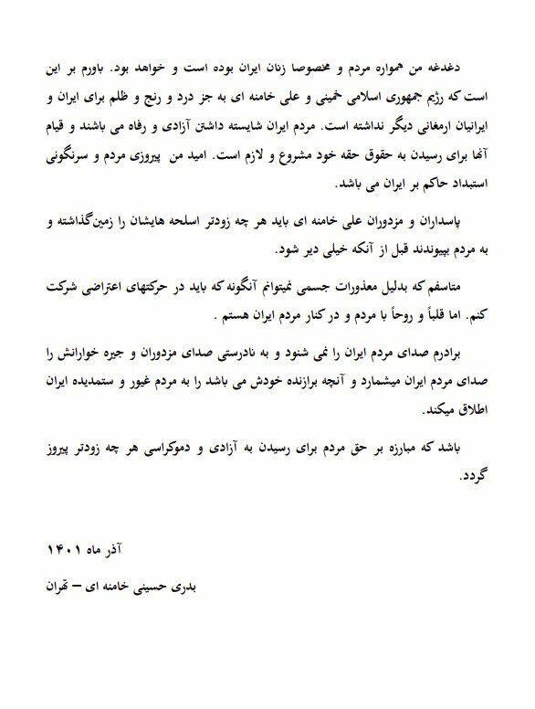 Molla rejiminin ali dini lideri Əli Xameneinin bacısı və bu rejimi tənqid edən ruhani Əli Tehraninin xanımı Bədri Hüseyni Xamenei açıq məktub yayaraq, qardaşının və onun avtoritar xilafətinin əleyhinə olduqlarını bəyan edib.
