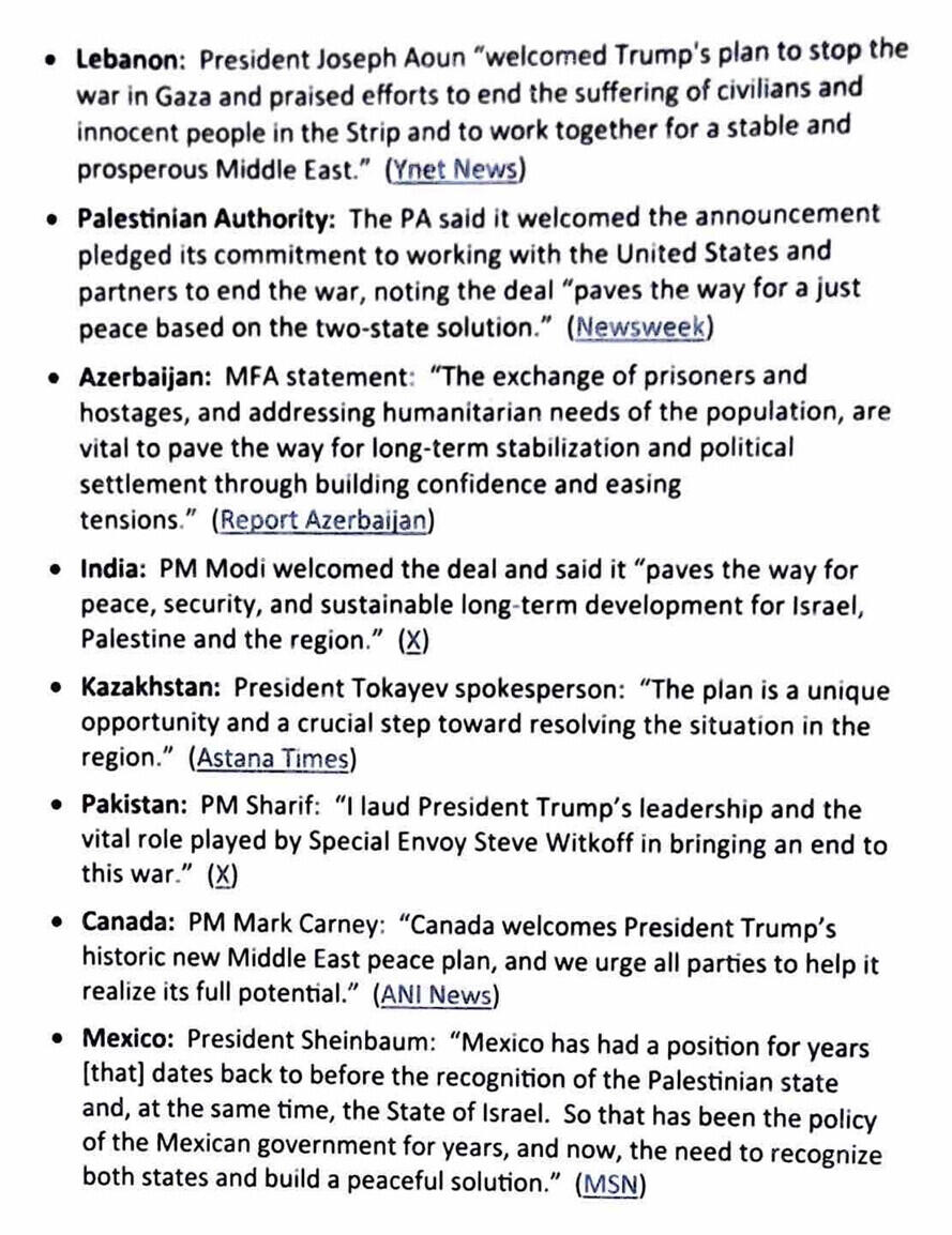 Milli.Az xəbər verir ki, Tramp paylaşımında Yaxın Şərqdə sülh səylərinə dair müxtəlif ölkələrin bəyanatlarına yer verib.