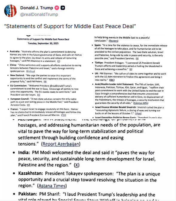 ABŞ Prezidenti Donald Tramp sosial media hesabında Qəzzada münaqişəni sonlandırmaq üçün irəli sürdüyü 20 maddəlik sülh planı ilə bağlı paylaşım edib.