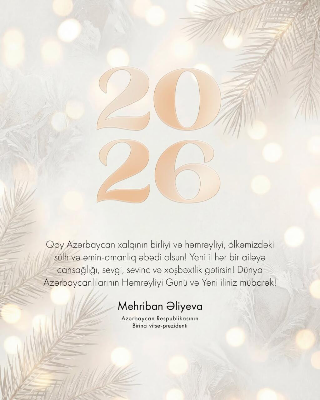 Azərbaycan Respublikasının Birinci vitse-prezidenti Mehriban Əliyeva Dünya Azərbaycanlılarının Həmrəyliyi Günü və Yeni il ilə əlaqədar rəsmi "Instagram" səhifəsində paylaşım edib.
