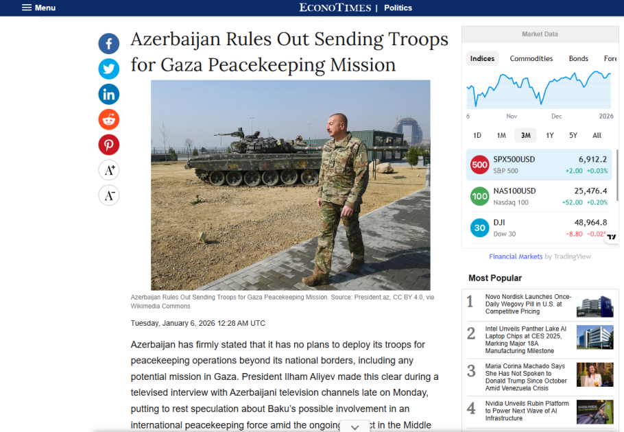 Beynəlxalq iqtisadiyyat portalı "İnvesting.com", İsrailin "The Jerusalem Post", "Israelhayom", "Time of Israel" qəzetləri, rus dilində nəşr olunan "Vesti İzrail" portalı, Bolqarıstanın "Dnevnik" nəşri, Yunanstanın "Skai" internet resursu da Azərbaycan Prezidentinin Yaxın Şərqdə münaqişələrə dair fikirlərini dərc edib. Materiallarda qeyd olunub ki, Prezident İlham Əliyev Qəzza zolağına sülhməramlıların göndərilməsi ilə bağlı yayılan yanlış məlumatları təkzib edib və bu xəbərlərin ilk mənbəyi olan ABŞ tərəfinə diplomatik kanallarla 20 sualdan ibarət müraciət çatdırdığını, həmçinin bununla bağlı təəssüfləndiyini bildirib.