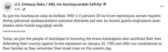 ABŞ səfirliyi 20 Yanvar faciəsinin 36-cı ildönümü ilə bağlı başsağlığı verib.