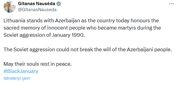 "Litva 1990-cı ilin yanvarında Sovet ordusunun təcavüzü nəticəsində şəhid olan günahsız insanların müqəddəs xatirəsi yad edilərkən Azərbaycanın yanında olduğunu bildirir. Sovet ordusunun təcavüzü Azərbaycan xalqının iradəsini sındıra bilmədi. Şəhidlərin ruhları şad olsun", - G.Nauseda vurğulayıb.