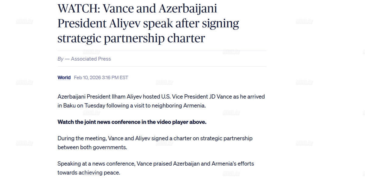 Bununla yanaşı, "Reuters"də dərc olunmuş "ABŞ və Azərbaycan Vensin səfəri çərçivəsində strateji tərəfdaşlıq müqaviləsi imzalayıblar" sərlövhəli yazıda qeyd olunur ki, Azərbaycan Prezidenti İlham Əliyev mətbuata birgə bəyanat zamanı ABŞ və Azərbaycan arasında münasibətlərin bu gün tamamilə yeni mərhələyə qədəm qoyduğunu deyib. Yazıya əsasən, Vens bildirib ki, ABŞ Azərbaycana ərazi sularını qorumaq üçün gəmilər göndərəcək. Vurğulanır ki, Xartiya ilk dəfə avqust ayında Vaşinqtonda Prezident İlham Əliyevlə Prezident Donald Tramp arasında danışıqlarda təqdim olunub.