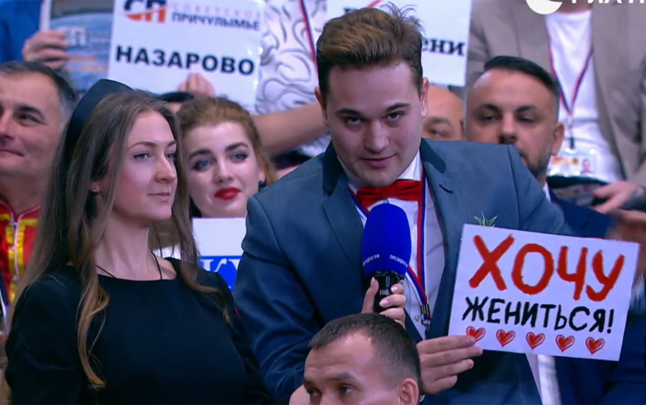 Milli.Az xəbər verir ki, Yekaterinburqdan olan 22 yaşlı jurnalist Kirill Bajanov tədbirə "Evlənmək istəyirəm" yazılı plakatla qatılıb.