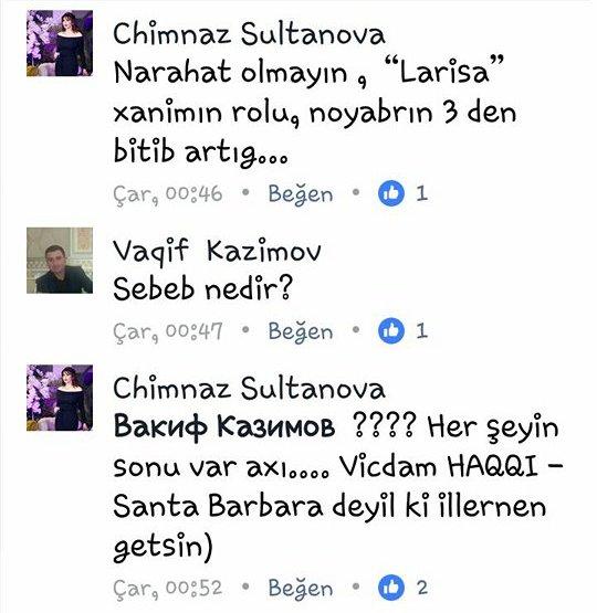 Milli.Az-a daxil olan məlumata görə, aktrisa Çimnaz Sultanova "Vicdan haqqı" serialından gedib. 1 ay öncə serialı öz istəyi ilə tərk edən aktrisa hal-hazırda aparıcılıq edir. Məşhur aktrisa hətta sosial şəbəkədə izləyicisinin ona "Larisa xanım, qorxuram başınız aparıcılığa qarışsın, sizi də sonra serialdan çıxarsınlar" sualını da cavabsız qoymayıb: