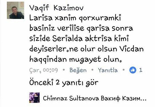 "Narahat olmayın, Larisa xanımın rolu noyabrın 3-dən artıq bitib. Hər şeyin bir sonu var, "Vicdan haqqı" axı "Santa Barbara" serialı deyil ki, illərlə getsin", - deyə aktrisa cavab bildirib.