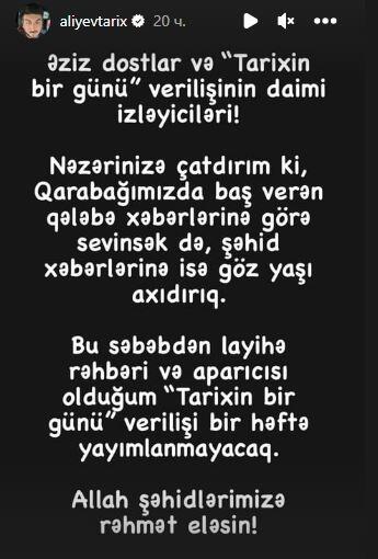 "Qarabağda baş verən qələbə xəbərlərinə görə sevinsək də, şəhid xəbərlərinə göz yaşı axıdırıq. Bu səbəbdən layihə rəhbəri və aparıcısı olduğum "Tarixin bir günü" verilişi bir həftə yayımlanmayacaq" deyə, Tolik bildirib.