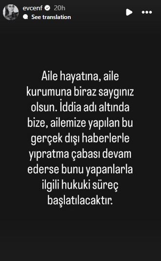 "Ailə həyatına, ailə qurumuna bir az hörmətiniz olsun. İddialarla, gerçək olmayan xəbərlərlə bizi, ailəmizi tükətməyə çalışmağa davam etsələr, hüquqi addımlar atılacaq", - F.Evcen bildirib.