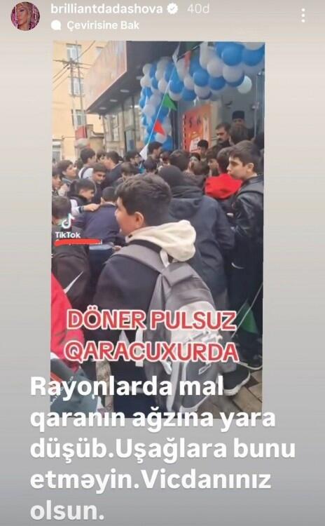 Milli.Az xəbər verir ki, sənətçi Qaraçuxurda pulsuz dönər paylanılmasını qınayıb. Belə ki, ifaçının yayımladığı görüntülərdə azyaşlı uşaqların çoxluq təşkil etməsi diqqət çəkib.