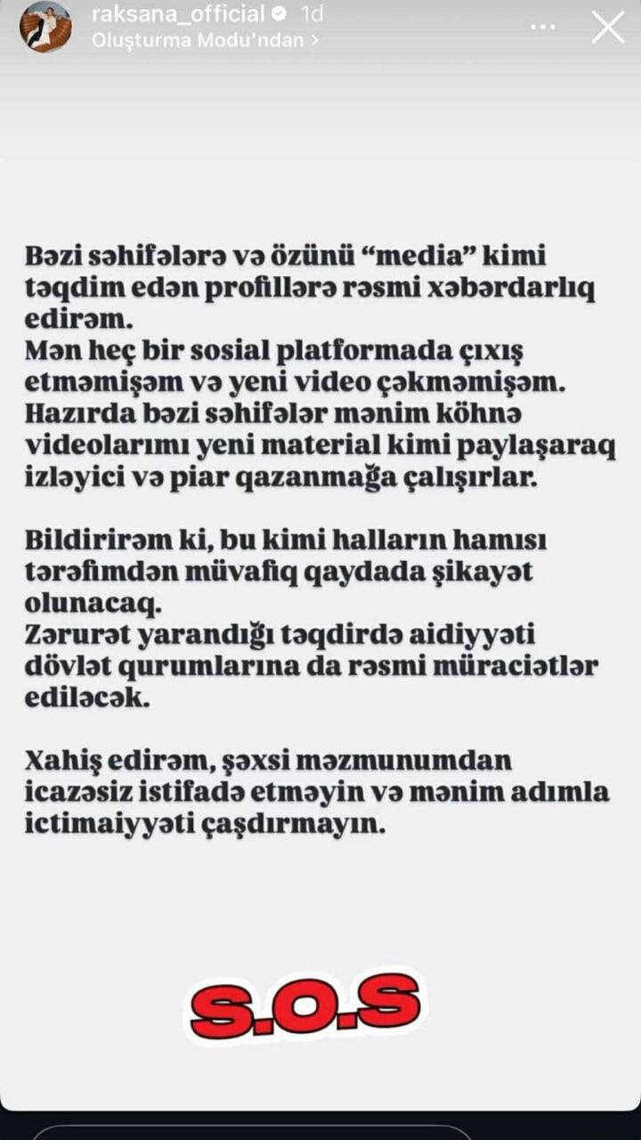 Mən heç bir sosial platformada çıxış etməmişəm və yeni video çəkməmişəm. Hazırda bəzi səhifələr mənim köhnə videolarımı yeni material kimi paylaşaraq izləyici və piar qazanmağa çalışırlar".