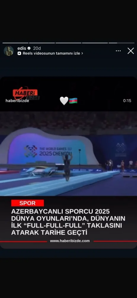 Milli.Az xəbər verir ki, 2025 Dünya Oyunlarında idmançımız Tofiq Əliyev dünya arenasında ilk dəfə "full-full-full" elementini yerinə yetirərək dünya çempionu adını qazanıb və tarixə düşüb.