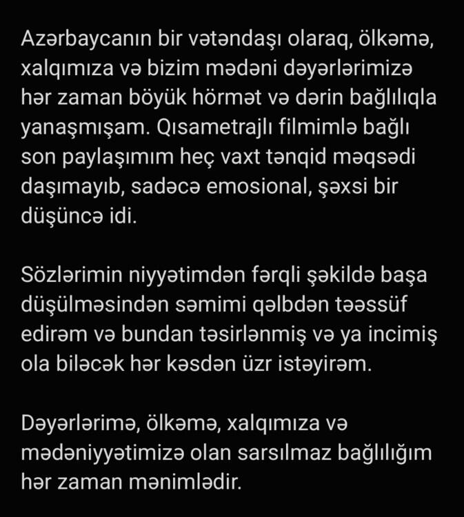 Milli.Az-ın məlumatına görə, tənqidlərdən sonra rejissor sosial şəbəkə hesabında açıqlama verərək üzr istəyib.