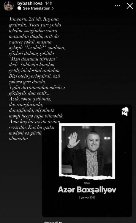 O, aktyor Azər Baxşəliyevin xəstəxanaya yerləşdirildiyi günü yaşadıqlarını bölüşüb: