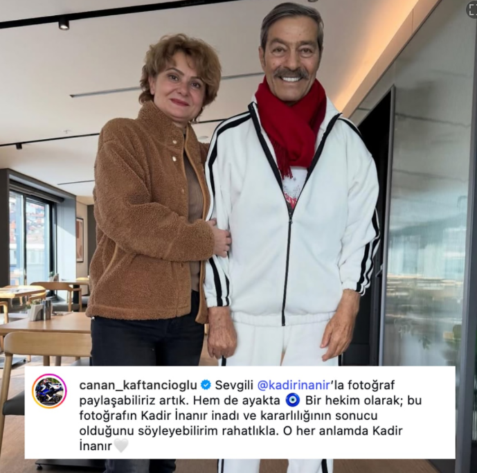 Sənətçini CHP İstanbul İl Şöbəsinin keçmiş sədri Canan Kaftancıoğlu ziyarət edib. Kaftancıoğlunun sosial şəbəkədə paylaşdığı fotoda Kadir İnanırın ayaq üstə durduğu və sağlam, enerjili göründüyü diqqət çəkir.