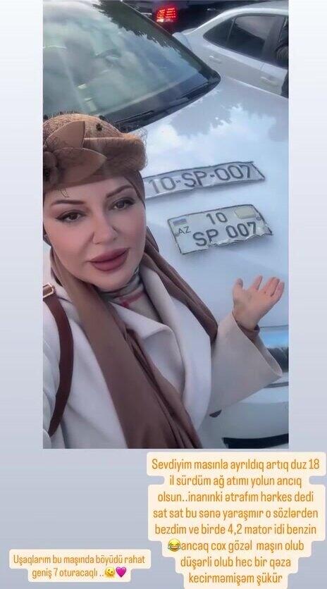 "Sevdiyim maşınımla ayrıldıq, düz 18 il sürdüm ağ atımı. Yolun açıq olsun. İnanın ki, ətrafımda hər kəs dedi ki, "Sat, sat, bu sənə yaraşmır". O sözlərdən bezdim. Bir də ki, 4.2 benzin mühərrik idi".