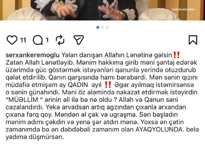 "Kim yalan danışırsa, Allah özü cəzasını versin. Mənim haqqıma girərək şantaj yolu ilə təzyiq göstərmək istəyənlər qanun qarşısında cavablarını alıblar. Qanun hamı üçün eynidir. Mən sənin qızını müdafiə etmişəm. Əgər bunu başa düşmək istəmirsənsə, bu artıq sənin seçimindir. Məni öz bildiyin üsullarla cəzalandırmaq istədin, amma nəticədə hər şeyi Allah və qanun həll etdi. Artıq dediyin sözlərə diqqət et. Məndən uzaq dur. Bu mövzunu ilk gündəmə gətirən də sən oldun, yenə də adımı hallandırdın. Açığı, sən heç mənim yadımda da deyilsən".