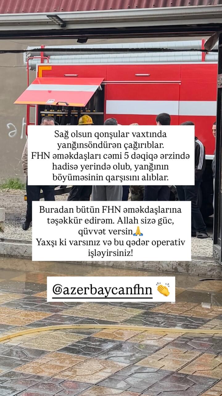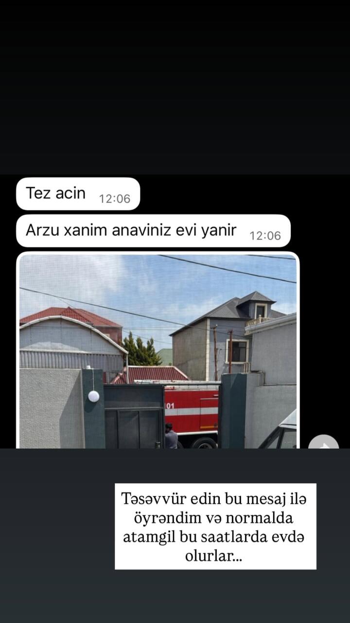 "Atamgilin bağında yanğın olub. Xoşbəxtlikdən evdə olmayıblar. İlk eşidəndə yaşadığım həyəcanı Allah heç kimə göstərməsin, dəhşət idi. Normal halda valideynlərim o saatlarda evdə olurdular. Qonşularım sağ olsunlar, FHN əməkdaşlarını çağırıblar. Onlar yanğının böyüməsinin qarşısını alıb. Yaxşı ki, varsınız".