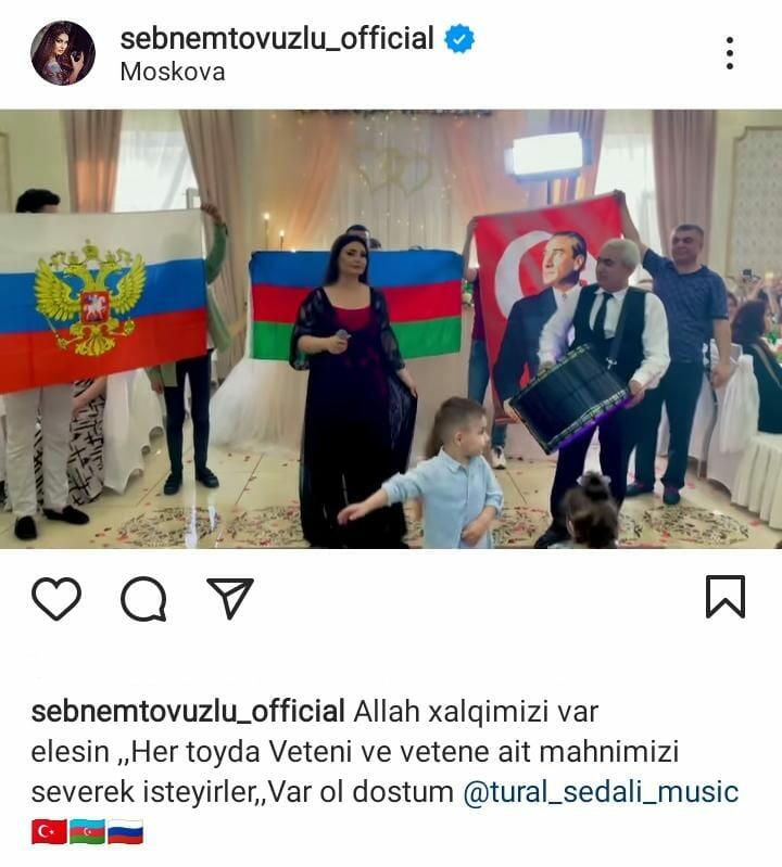 Toy üçün Rusiyaya üz tutan müğənni Şəbnəm Tovuzlu məclislərin birindən videosunu paylaşıb. O komment bölməsində Azərbaycan və Rusiya bayraqlarını da əlavə edib.