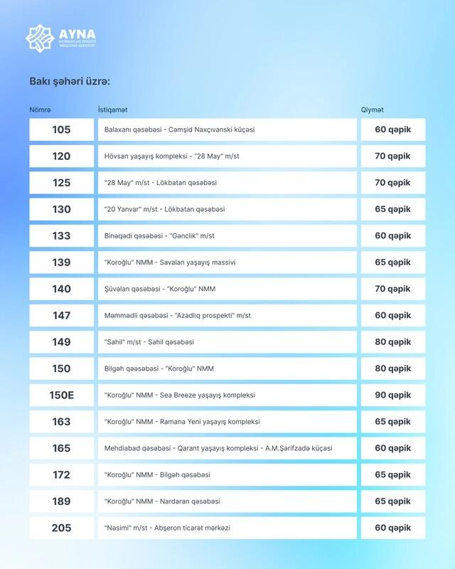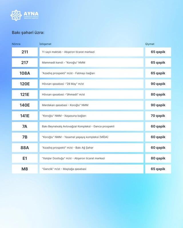 Qeyd edək ki, sentyabrın 29-da Rəqəmsal İnkişaf və Nəqliyyat Nazirliyinin Kollegiyası avtobus marşrutları və metroda sərnişindaşıma üzrə yeni tariflər müəyyən edib. Qərara əsasən, müasir tələblərə cavab verən və yalnız nağdsız ödəniş alətləri vasitəsilə fəaliyyət göstərən müntəzəm şəhərdaxili (rayondaxili), qəsəbələrarası və şəhərətrafı avtobus marşrutlarında sərnişindaşıma xidmətlərinin tariflərinin aşağı həddi (məsafədən asılı olaraq tariflər dəyişir) də 60 qəpik olaraq müəyyən edilib. Qərar oktyabrın 1-dən qüvvəyə minib.