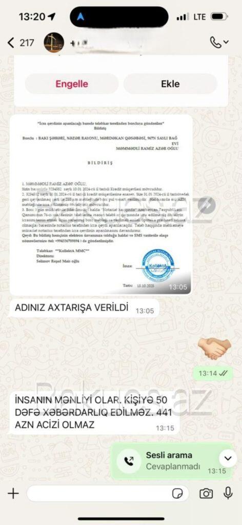 Şikayətçi Məmmədli Ramiz Azər oğlu bildirib ki, sözügedən kredit təşkilatı borc ödənilmədiyi üçün müştərini məhkəməyə verib və bununla bağlı qarşı tərəfə məlumat verib. Təşkilat əməkdaşı daha sonra şəxsin axtarışa verildiyini qeyd edərək, vəsaitin ödənməsini tələb edib. Lakin bu tələb formasında müştərinin şəxsiyyəti alçaldılıb.
