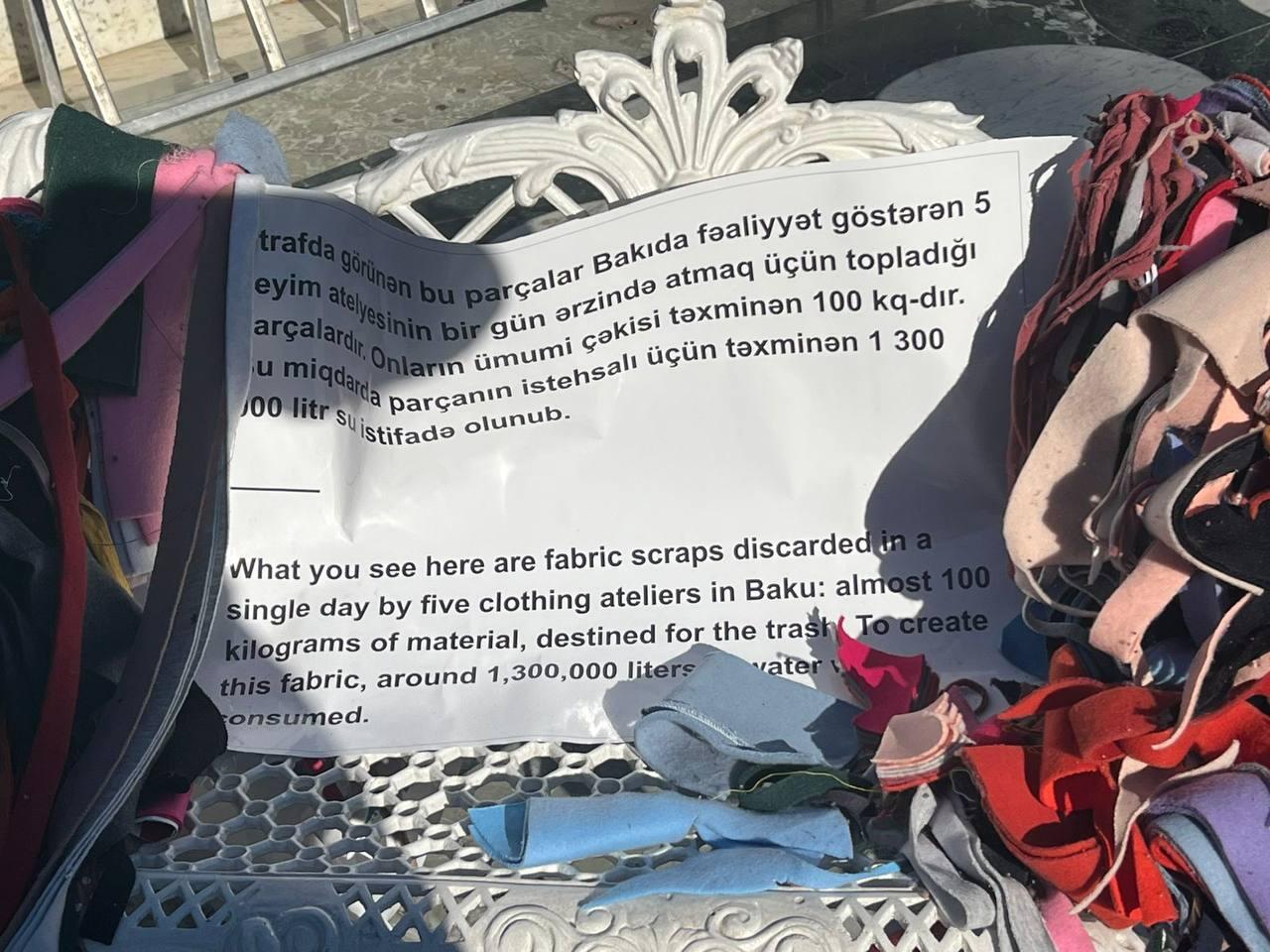 Posterdə qeyd olunub ki, yerdə olanlar Bakıda fəaliyyət göstərən atelyelerdən atılan parçalardır və onların hazırlanması üçün ton yarıma yaxın su sərf olunur.
