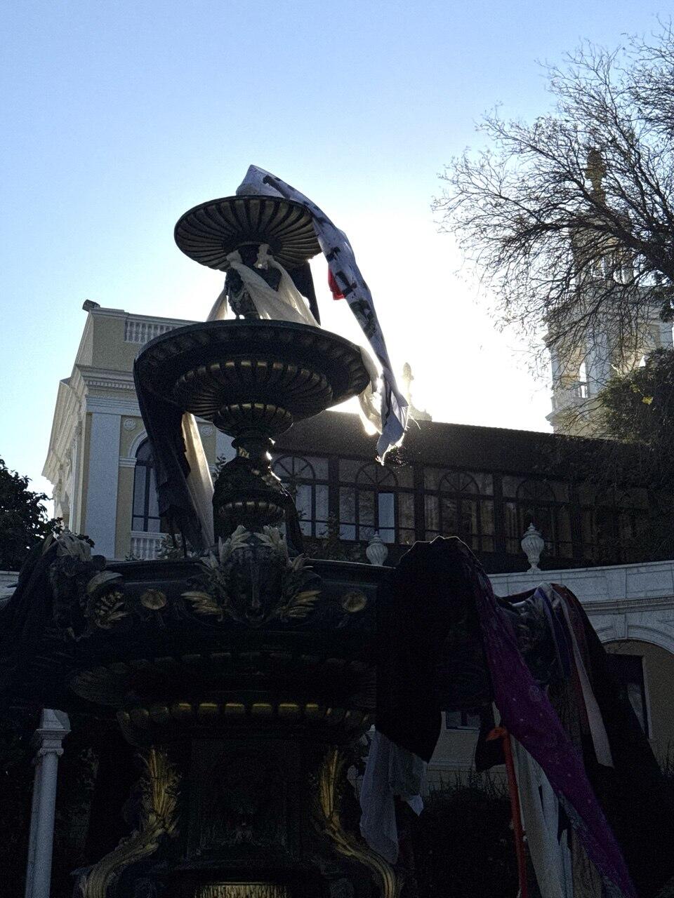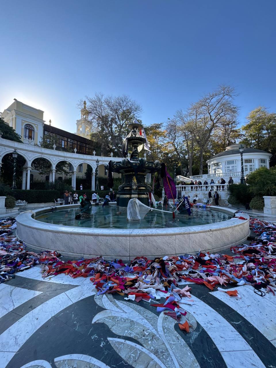 Milli.Az bildirir ki, hovuzun ətrafı parça qalıqları ilə doludur. Kənardan baxımsız görünsə də, əslində məqsəd parçaların hazırlanması üçün sərf olunmuş tonlarla suya diqqət çəkmək üçün belə edilib.