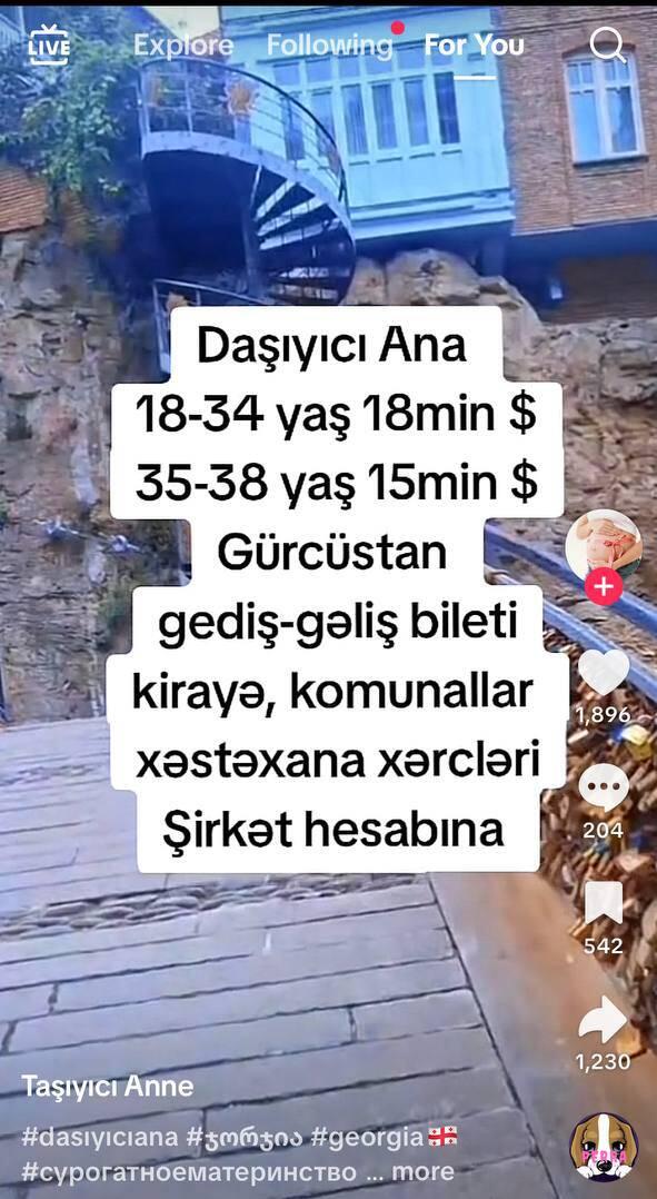 Milli.Az xəbər verir ki, tiktok-da edilən paylaşımlarda qadınlara Gürcüstanda daşıyıcı ana olmaq imkanı yaradılacağı və bunun müqabilində 18 min dollar pul ödənəcəyinə dair vəd verirlər. Hətta, qadın daha gəncdirsə ona ödənən məbləğ daha çox olur. Bu ödənişdən əlavə təyyarə bileti, gediş-gəliş və qalmaq xərcləri də qarşılanır.