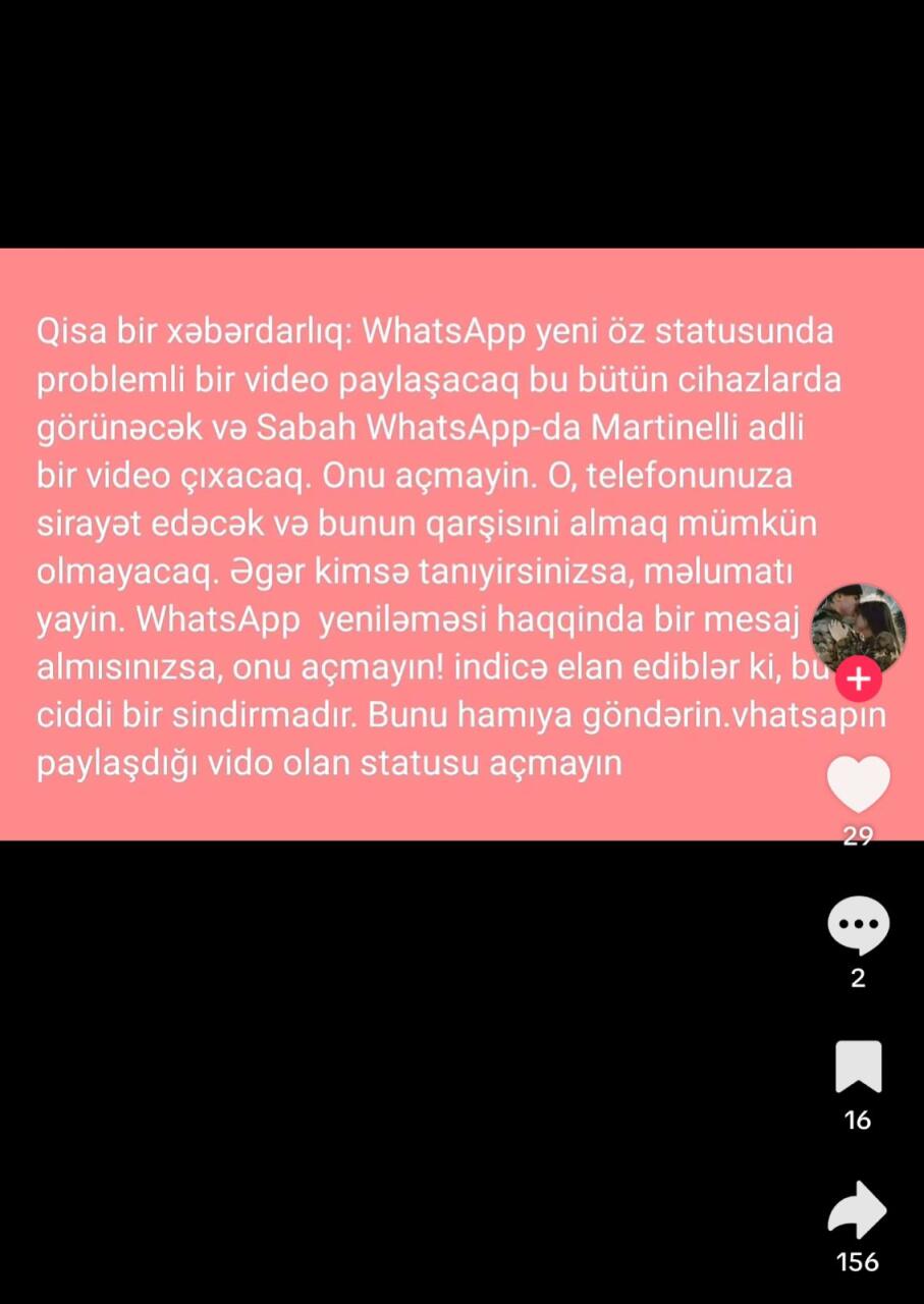 Milli.Az-ın məlumatına görə, bildirilir ki, guya "WhatsApp"da "Martinelli" adlı təhlükəli video statuslarda paylaşılacaq və onu açan istifadəçilərin hesabı ələ keçirilcək.
