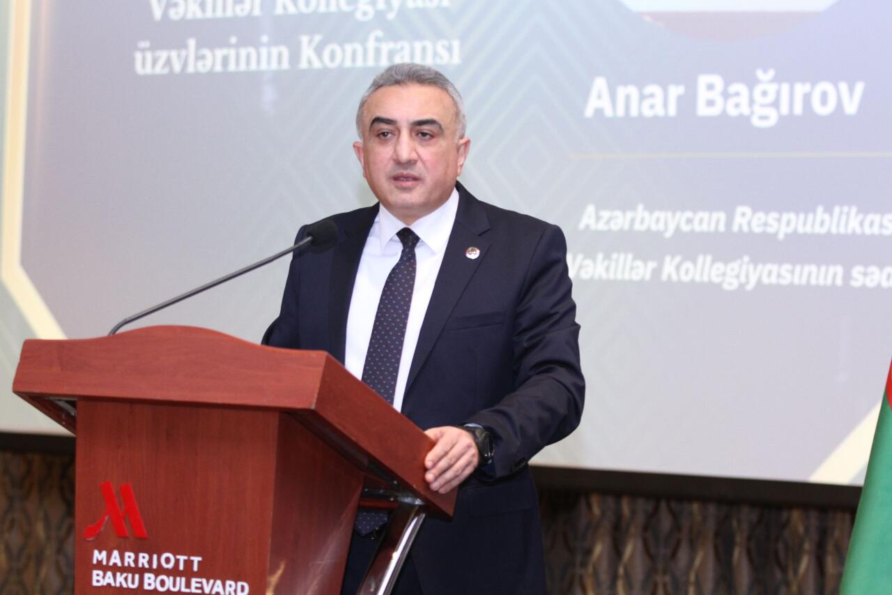 Açılış nitqi ilə çıxış edən VK sədri Anar Bağırov tədbirin gündəliyini iştirakçıların diqqətinə çatdırıb, Kollegiyanın son illər ərzindəki fəaliyyətinə geniş şəkildə nəzər salıb, ölkəmizdə vəkillik institutunun keçdiyi tarixi inkişaf yolunu təhlil edib. Sədr qeyd edib ki, ötən dövrlər ərzində vəkillik institutunun gücləndirilməsi, hüquqi yardımın keyfiyyətinin yüksəldilməsi və vətəndaşlar üçün əlçatanlığın təmin olunması istiqamətində ardıcıl və sistemli islahatlar həyata keçirilib. Görülən tədbirlər nəticəsində vəkillərin sayında əhəmiyyətli artım baş verib, onların peşəkar hazırlıq səviyyəsi yüksəldilib, davamlı tədris və ixtisasartırma mexanizmləri formalaşdırılıb və müasir tələblərə uyğun olaraq təkmilləşdirilib. Eyni zamanda vəkillərin fəaliyyətinin şəffaflığının artırılması, peşə etikası qaydalarına əməl olunmasının gücləndirilməsi və institusional idarəetmənin modernləşdirilməsi sahəsində mühüm addımlar atıldığı vurğulanıb.