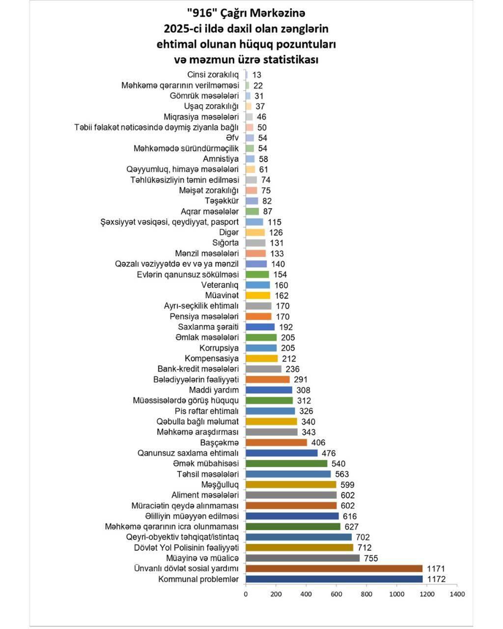Bundan əlavə, statistikada ən az müraciət qeydə alınan sahələr də açıqlanıb. Belə ki, miqrasiya məsələləri ilə bağlı 46, uşaq zorakılığı üzrə 37, gömrük məsələləri üzrə 31, məhkəmə qərarının verilməməsi ilə bağlı 22, cinsi zorakılıq mövzusu üzrə isə cəmi 13 müraciət daxil olub.