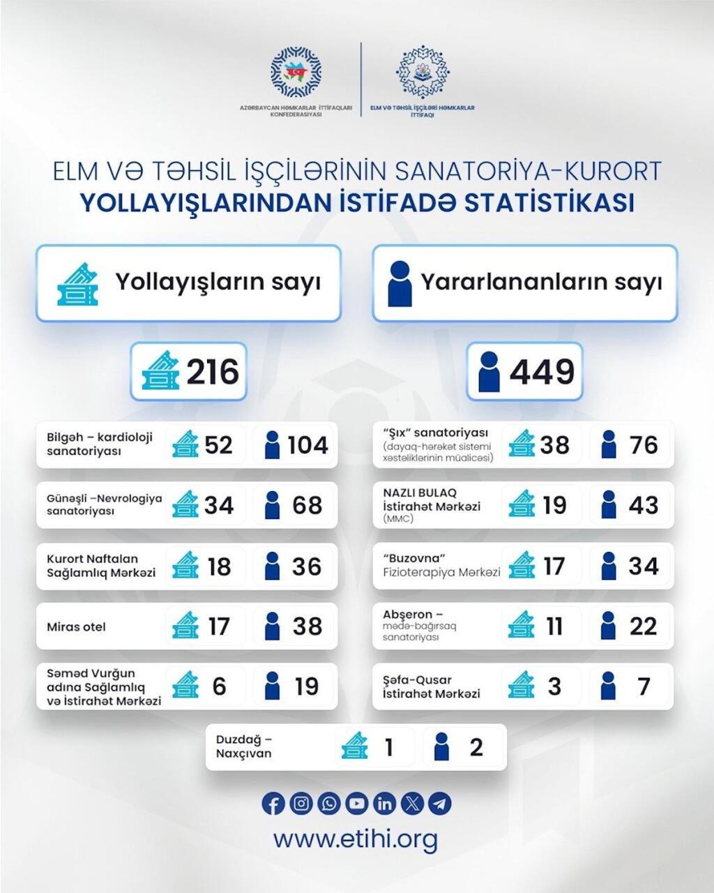 Milli.Az xəbər verir ki, hesabat dövründə ümumilikdə 216 nəfər təhsil işçisi sanatoriya yollayışları ilə təmin olunub. Bununla yanaşı, 449 nəfər ittifaq üzvü ailə üzvləri ilə birlikdə Azərbaycan Həmkarlar İttifaqları Konfederasiyasının nəzdində fəaliyyət göstərən sanatoriya və müalicə mərkəzlərində istirahət və müalicə proqramlarından yararlanıb.
