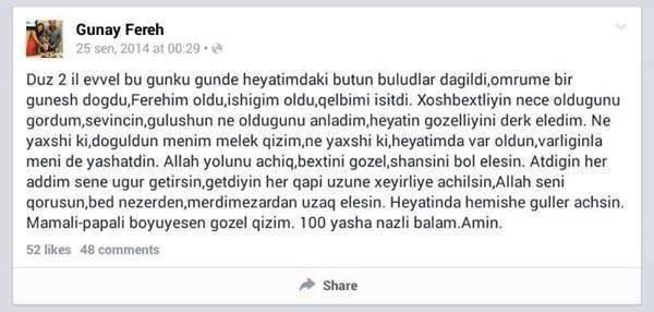 Günay xanım həmin statusunda yazmışdı: "Düz iki il əvvəl, bugünkü gündə həyatımdakı bütün buludlar dağıldı, ömrümə bir Günəş doğdu, Fərəhim oldu, işığım oldu, qəlbimi isitdi. Xoşbəxtliyin necə olduğunu gördüm, sevincin, gülüşün nə olduğunu anladım, həyatın gözəlliyini dərk elədim.