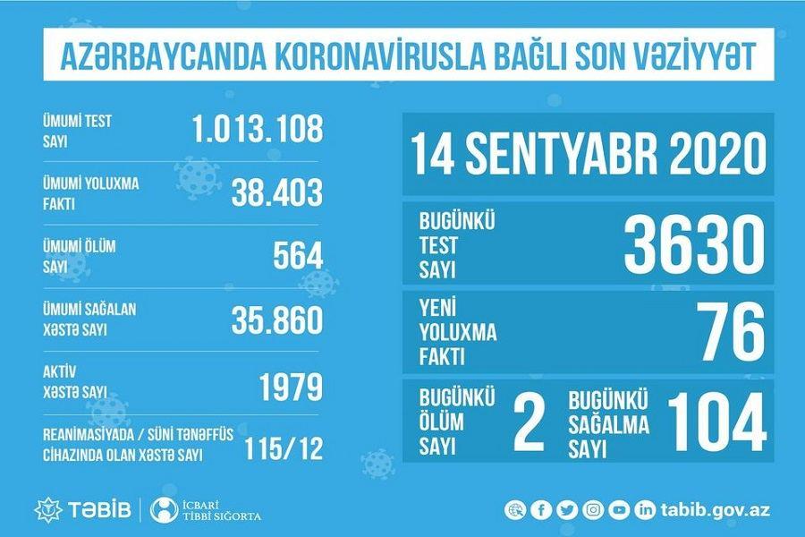 Qeyd olunub ki, ölkə ərazisində indiyə qədər 1 013 108 test aparılıb. Aktiv xəstə sayı 1 979 nəfərdir, onlardan 115 nəfər reanimasiyadadır, 12 nəfər isə süni tənəffüs aparatına qoşulub.
