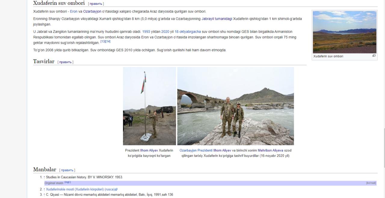 "Özbəkistandakı Heydər Əliyev adına Azərbaycan Mədəniyyət Mərkəzinin layihəsi ilə "Vikipediya" Beynəlxalq elektron ensiklopediyasında Azərbaycan və İranı birləşdirən, Ermənistan işğalından azad edilmiş Cəbrayıl rayonunda Araz çayı üzərində salınmış tarixi Xudafərin körpüsü haqqında özbək dilində bölmə istifadəyə verilib.
