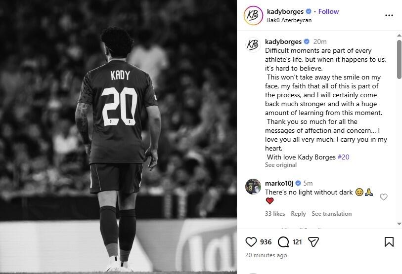 "Qarabağ"ın futbolçusu Kadi Borges zədəsi ilə bağlı instaqram hesabında paylaşım edib.