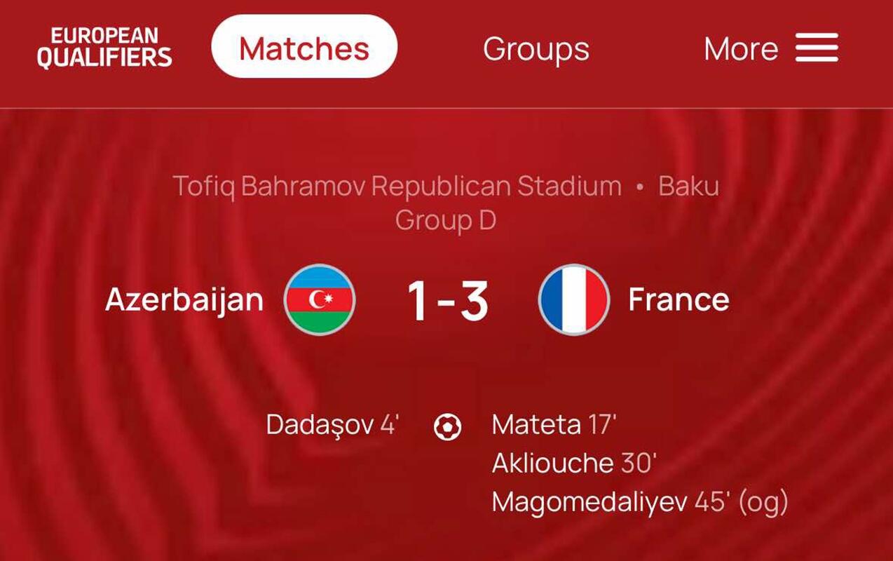 Azərbaycan yığması Bakıda Fransa millisinə 1:3 hesabı ilə məğlub olub.