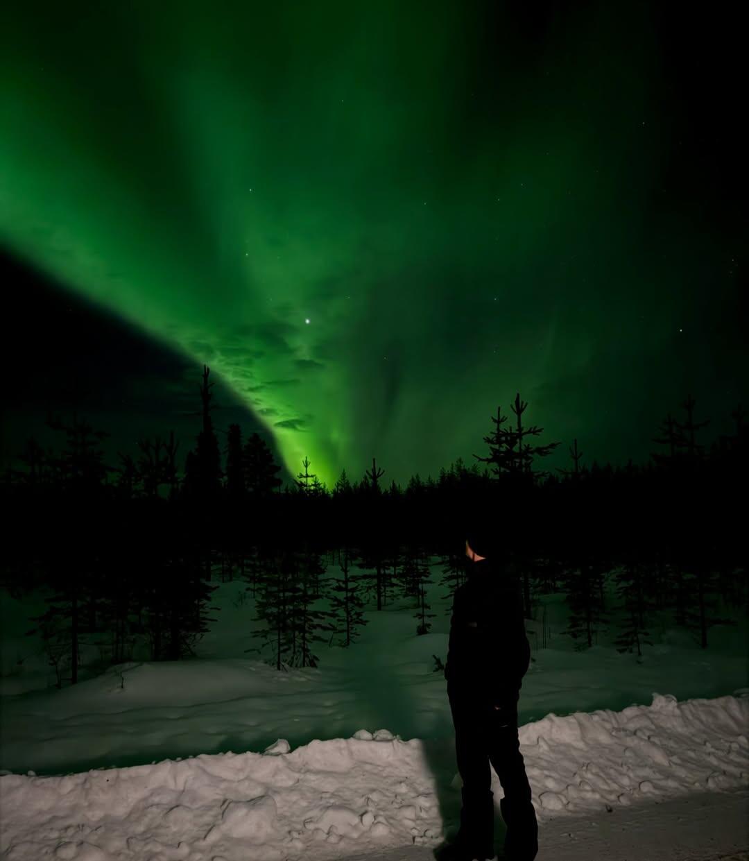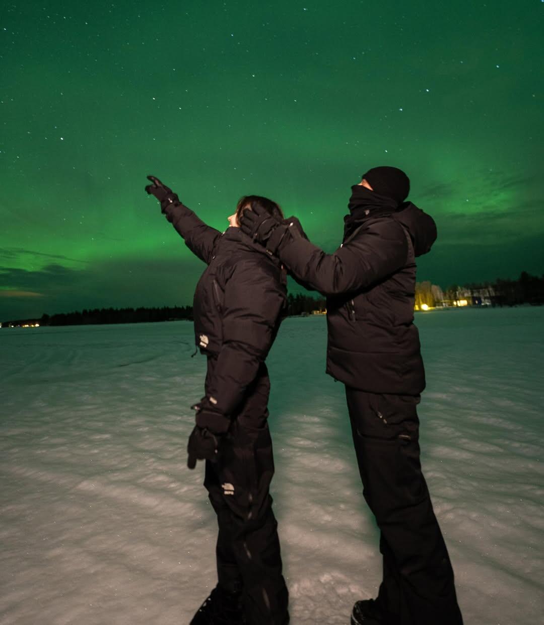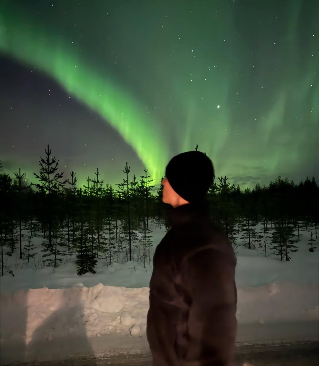 Cütlüyün qarlı bölgədə şimal işıqlarını seyr etdiyi görülür. Paylaşımlar sosial şəbəkələrdə maraqla qarşılanıb.