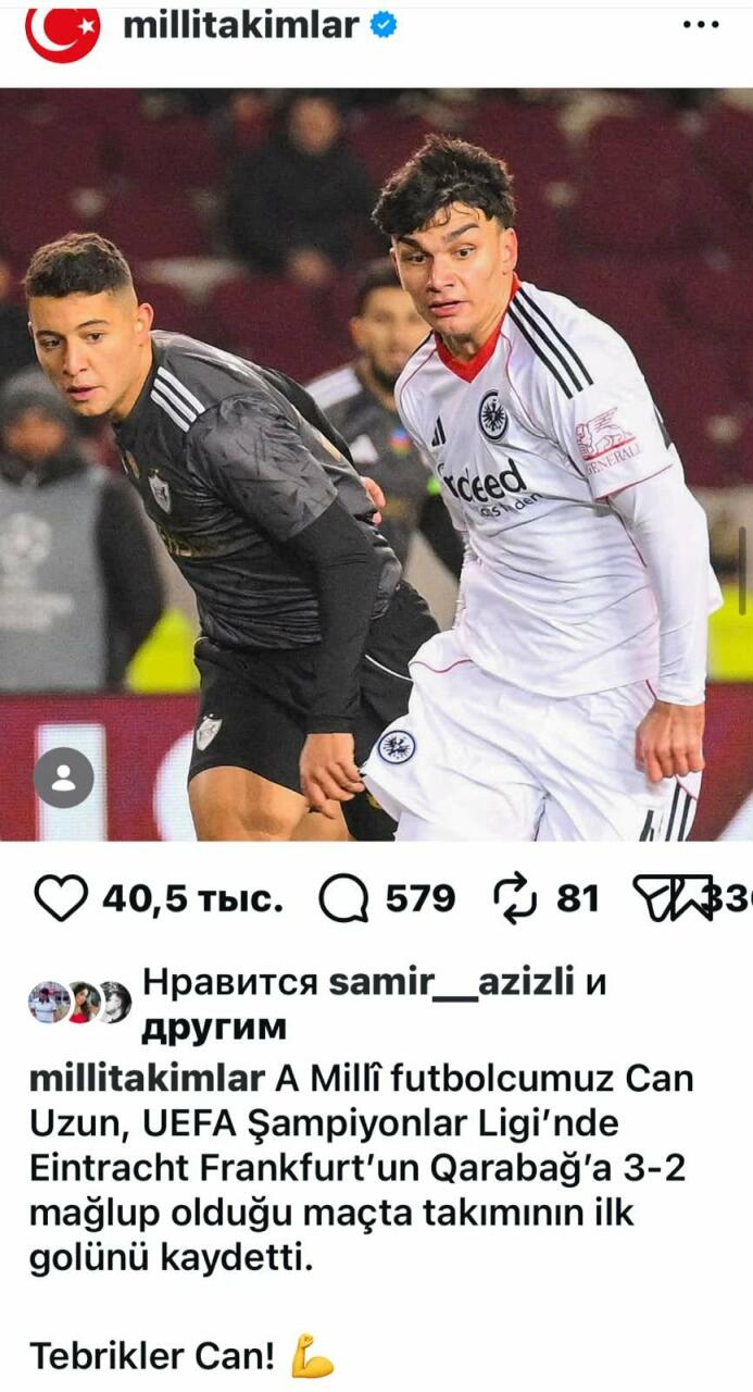 Milli komandanın oyunçusunun vurduğu qolun anonsunu verib, Canı təbrik ediblər. Ancaq qardaş ölkənin Çempionlar Liqasındakı layiqli təmsilçisi "Qarabağ"ı təbrik etmək yaddan çıxıb. Bəlkə də lüzum görməyiblər.