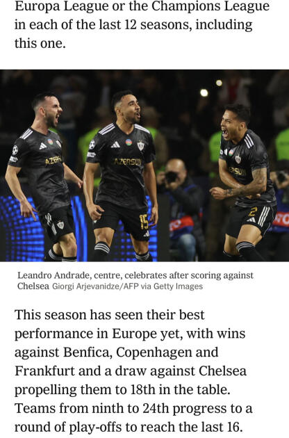 Məqalədə "Qarabağ"ın bu mövsüm Avropada ən uğurlu çıxışını nümayiş etdirdiyi, "Benfika", "Kopenhagen" "Ayntraxt"a qalib gəldiyi, "Çelsi" ilə heç-heçə etdiyi diqqətə çatdırılıb.